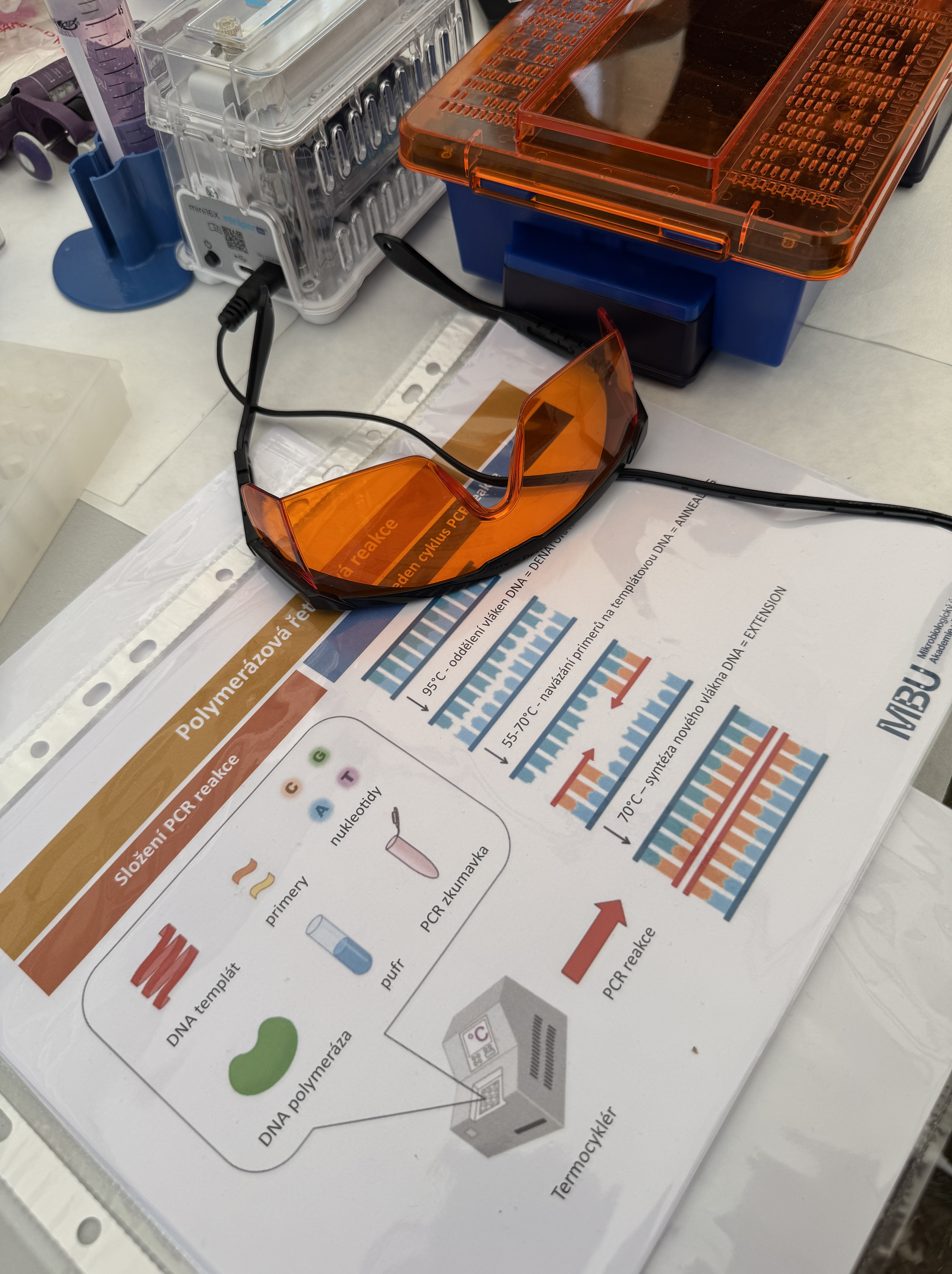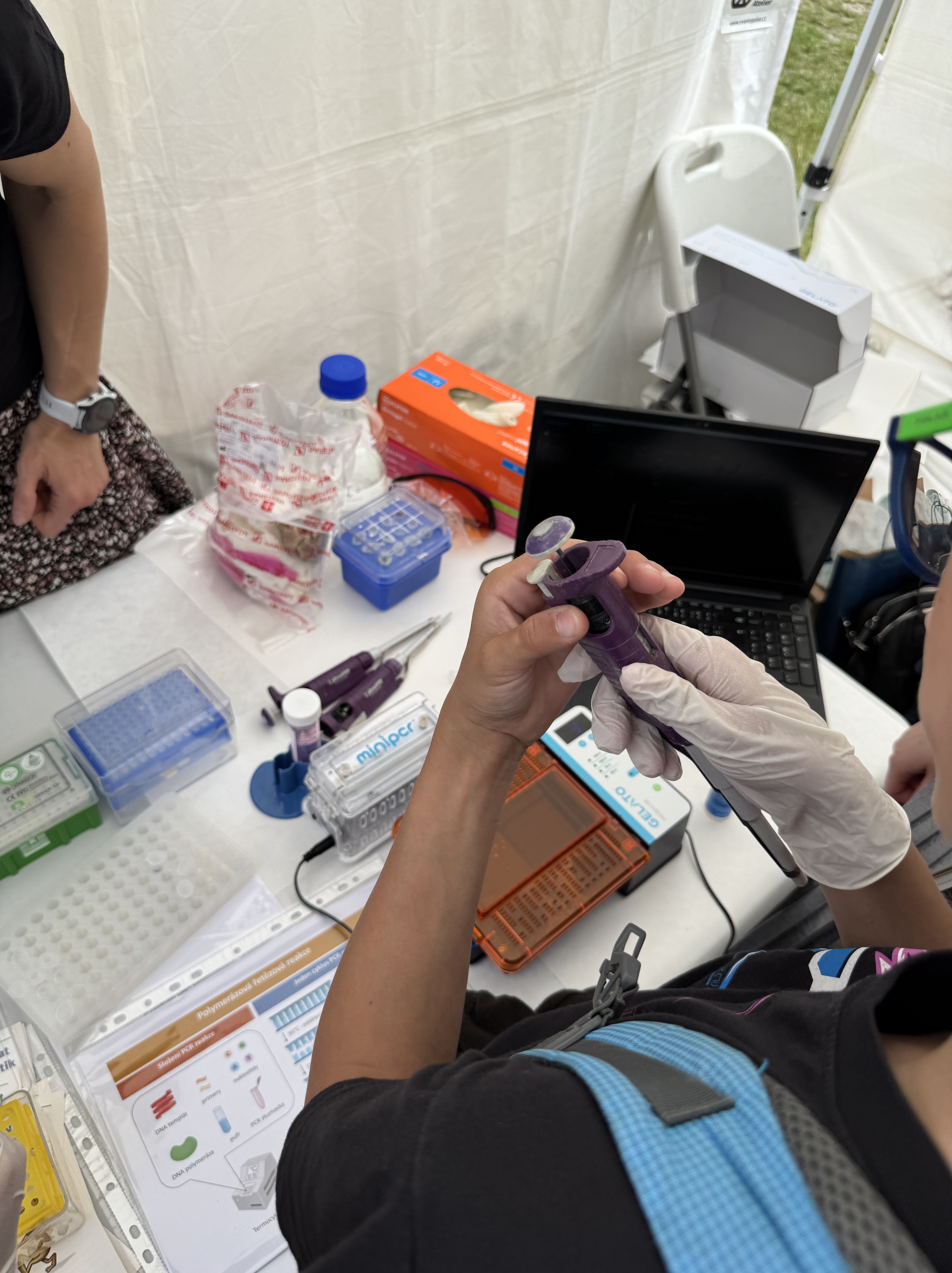 Velký zájem budilo také stanoviště věnované moderním metodám molekulární biologie. Díky Janě Wiedermannové a Veronice Kočárkové z Mikrobiologického ústavu Akademie věd se zde mohli účastníci seznámit s principem PCR (polymerázové řetězové reakce) a gelové elektroforézy, technik, které patří k základnímu vybavení každé laboratoře zabývající se DNA. Nechyběla ani možnost vlastní zkušenosti – pipetování si vyzkoušeli jak středoškoláci, tak i ti nejmenší, kteří poprvé drželi laboratorní pomůcku v ruce.