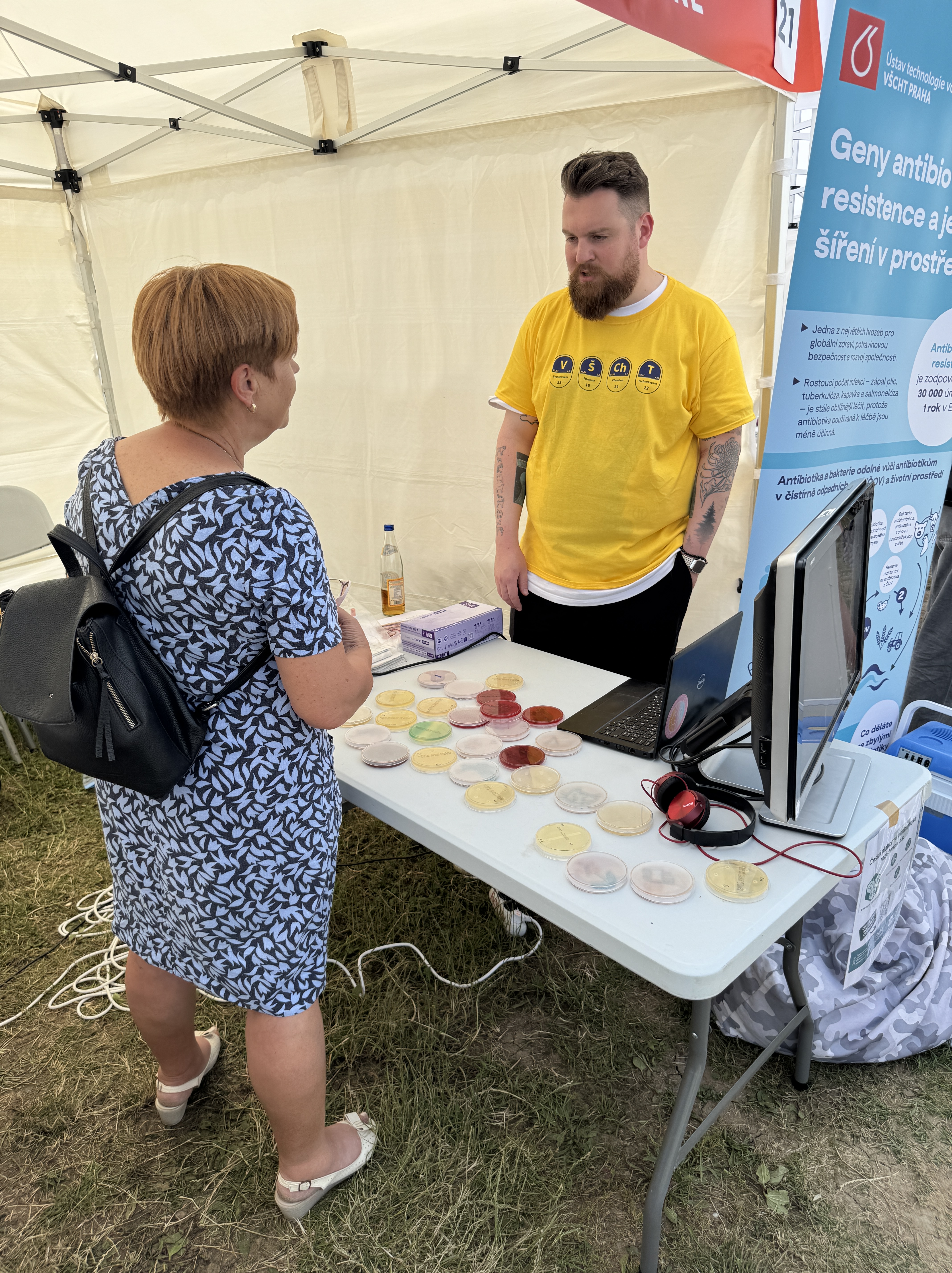 Další možností seznámení s mikrobiologií byly Petriho misky s různými druhy živných agarů, na nichž byly narostlé kolonie bakterií. Gabriela Kroneislová a Jan Závora z Všeobecné fakultní nemocnice návštěvníkům ukázali, jak rozdílně mohou mikroorganismy růst a vypadat v závislosti na prostředí, které jim poskytneme. Tento vizuálně atraktivní prvek pomohl vysvětlit, proč je kultivace mikrobů stále důležitou součástí výzkumu i diagnostiky.