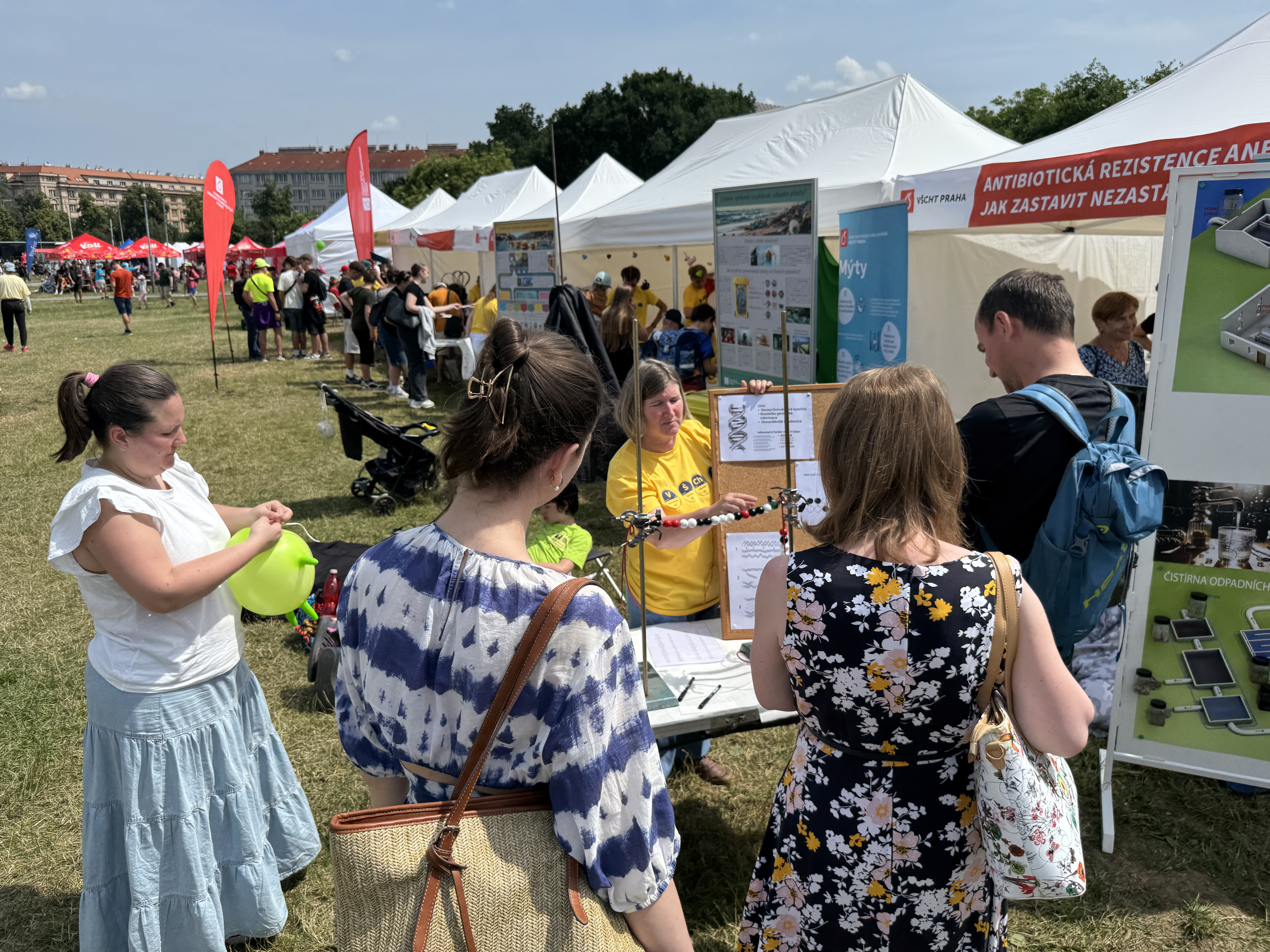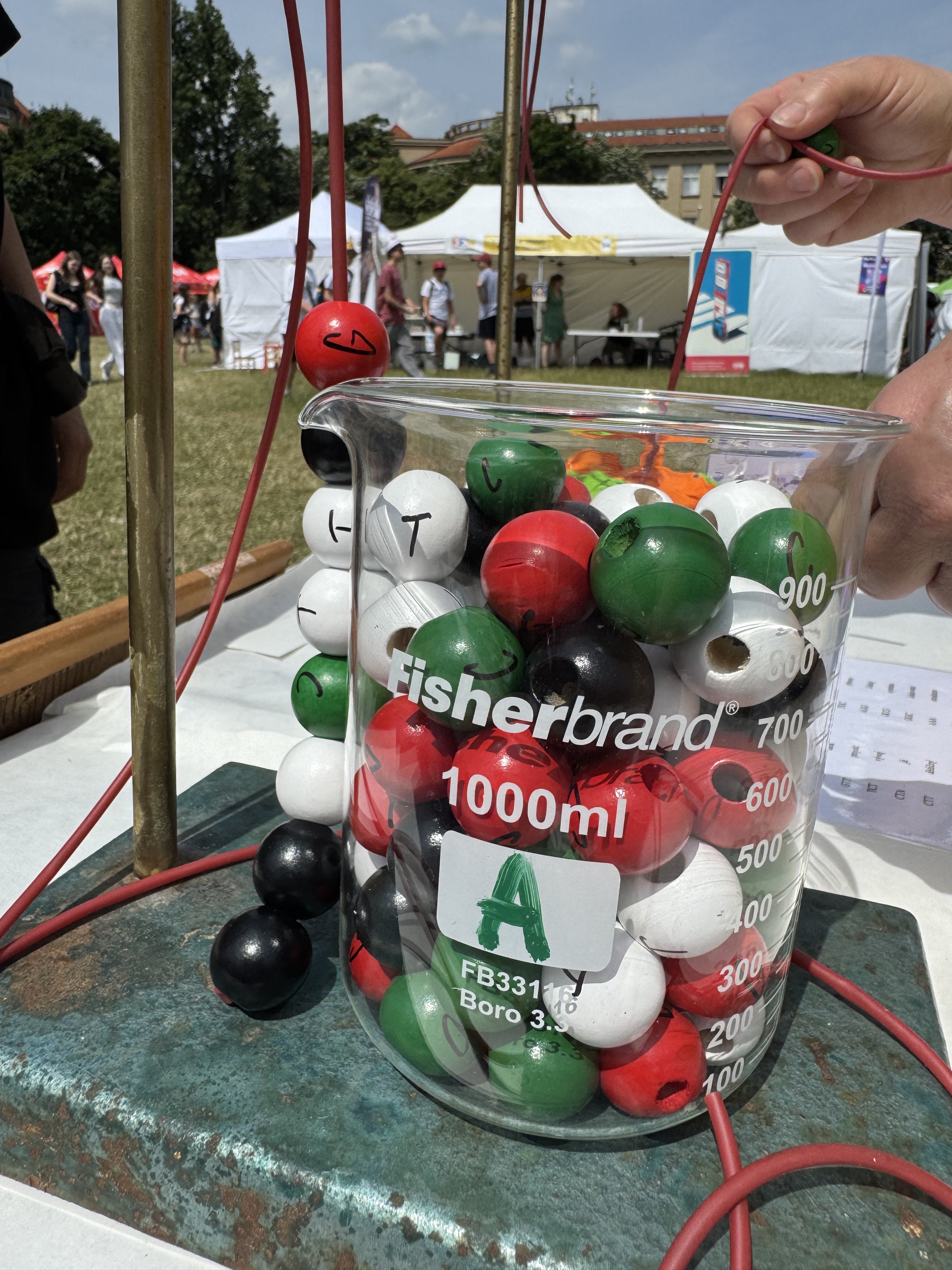 Neméně oblíbený byl korálkový model DNA, který připravila Jana Bartáčková z Ústavu technologie vody a prostředí Vysoké školy chemicko-technologické. Na tomto modelu si zejména děti mohly hravou formou osvojit princip komplementarity nukleotidů. Spojování barevných korálků podle pravidel genetického „kódu“ umožnilo pochopit, jak DNA ukládá informace, a zároveň poskytlo možnost zakódovat krátkou zprávu. Tento model tak ukázal, že složité biologické principy lze přiblížit jednoduchými pomůckami.