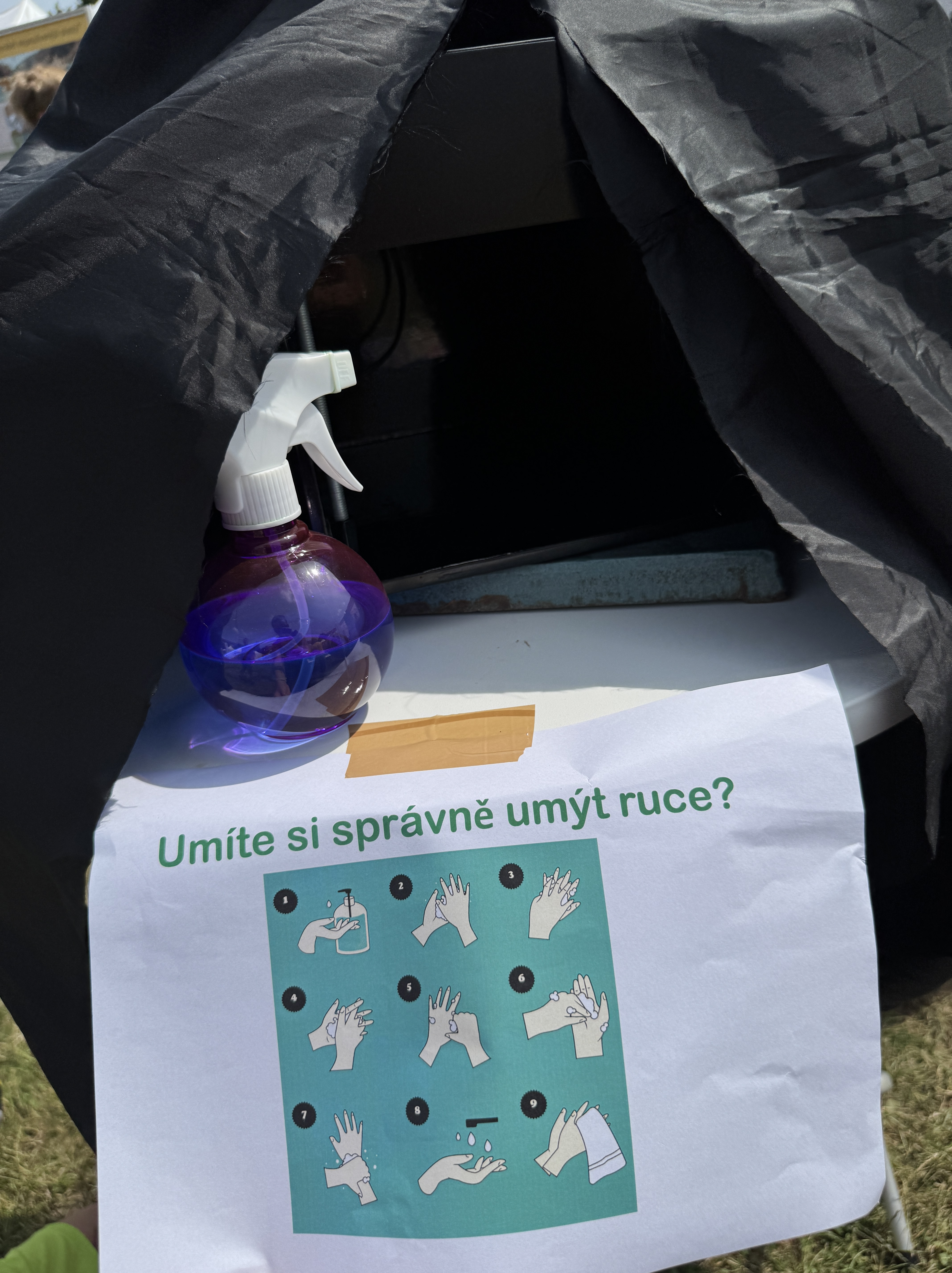 Zcela praktický rozměr měl další experiment Jany Bartáčkové, tentokrát s UV lampou, při němž si každý mohl ověřit, zda správně zvládá techniku mytí a dezinfekce rukou. Pod ultrafialovým světlem se snadno odhalilo, která místa byla vynechána – a ukázalo se, že i ti nejpečlivější někdy zapomenou na detaily, například na hřbety rukou či na prostor mezi prsty.